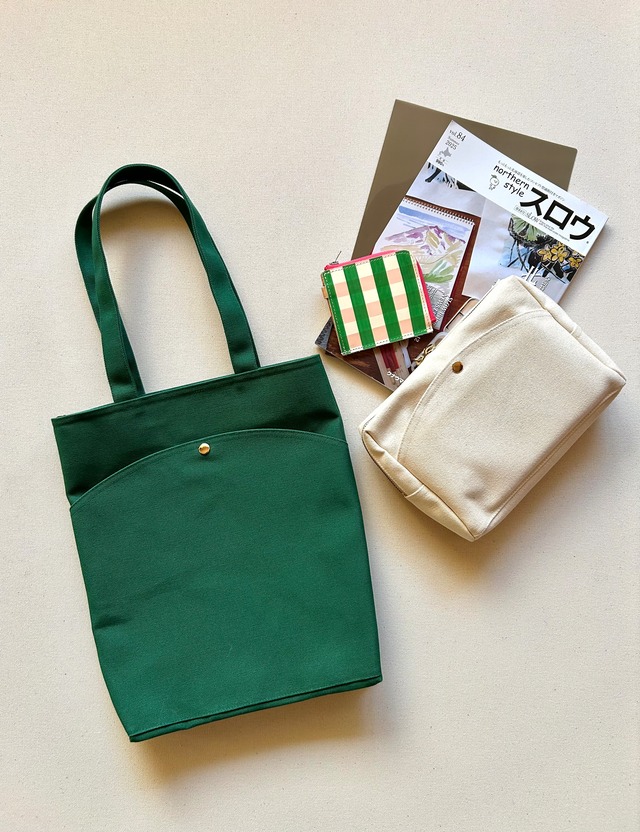 née/ライトミニトート néeのデザインから小さなトートができました! née(ニィ)とは、生まれるを意味するフランス語です。 何か新しいことが生まれる、 あるいは本来の自分を取り戻す、 手帳やノートによって 自分との大切なミーティングの時間を過ごす。 néeのデザインをそのままに、可愛いミニトートをご用意しました。 手帳一冊に薄いノート、2冊程度が入るサイズです。 中にはポケット一つ、外には曲線ポケットが一つ付いています。 シンプルな使いやすいデザインです。 大切な自分を過ごす時間、 自分の中の新たな発見ができるその瞬間、 あなたのそばにいる 手帳のためのトートバッグです。 *** 素材はしっかりとした倉敷帆布8号を使用しております。 お使い続けると、帆布生地は柔らかくエイジングしていきます。 その過程も楽しんでいただけたらと思います。 【お手入れ方法】 こちらの帆布バッグほつれ止め加工という張りのある加工がされています。 水洗いすると加工が落ち、生地の風合いが柔らかく変化してしまいます。 雨などで濡れてしまったら、まずは乾いた布で水分を拭き取りましょう。一部分だけ濡れていると輪染みのように跡が残ってしまう可能性があります。 固く絞った布でたたくようにバッグ全体を拭いてあげましょう。 定期的に防水スプレーをかけると防水防汚効果があり、汚れがつきにくくなるのでオススメです。 バッグがしっかりと乾いている状態で約30cm程度離したところから全体にスプレーしましょう。 スプレーしすぎると色ムラになる場合があるのでご注意ください。 スプレー後は、しっかりと乾かしてご使用ください(陰干し)。 ▽汚れが気になるとき バッグの角や、小さく汚れがついてしまった箇所は、白い消しゴムで軽く擦ってください。 強く擦りすぎたり、広範囲の汚れを落とす場合は色ムラや色落ちする場合がありますのでお控えください。 《素材》 富士金梅8号(綿100%) 《サイズ》 タテ26cm(中心)×ヨコ20cm×マチ4cm 《カラー》 グリーン ※商品の色味は実物と異なる場合がありますので、ご了承ください。