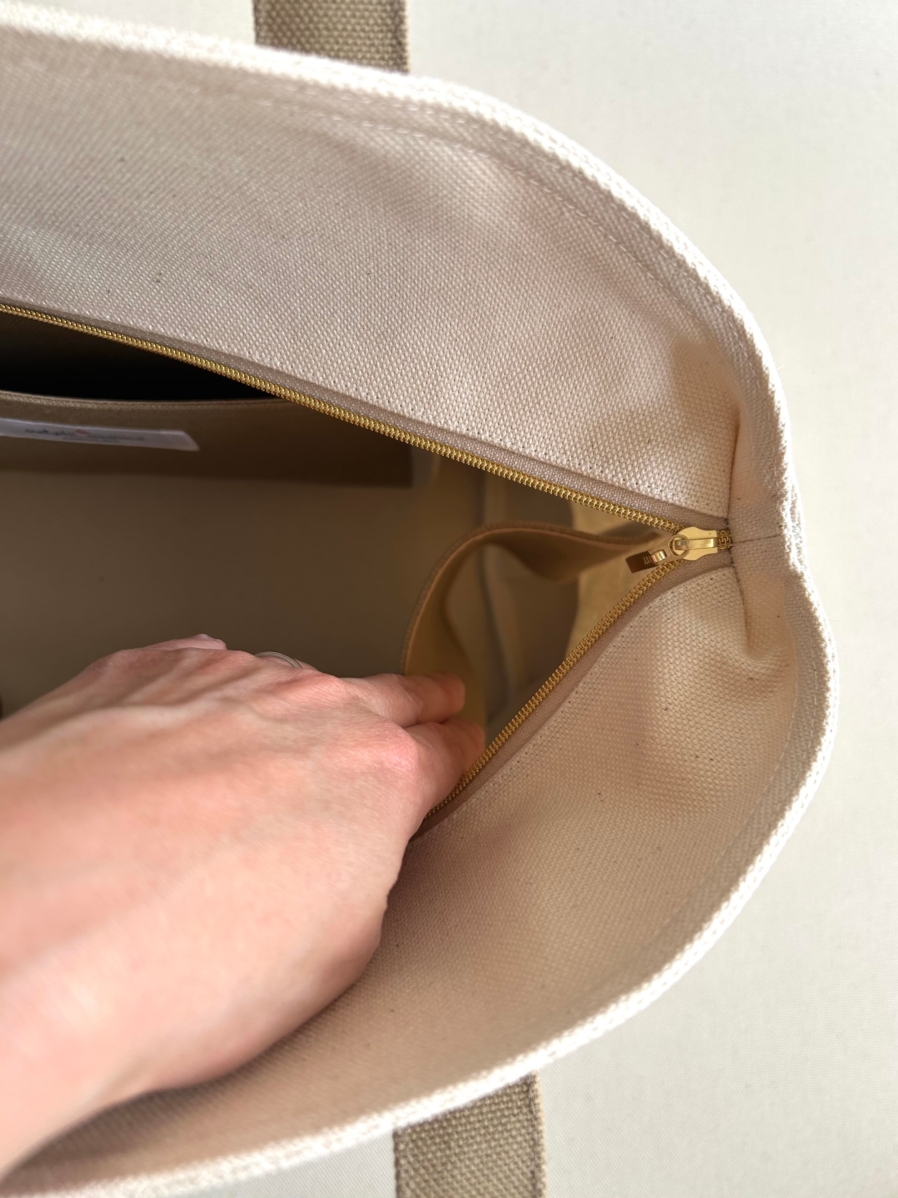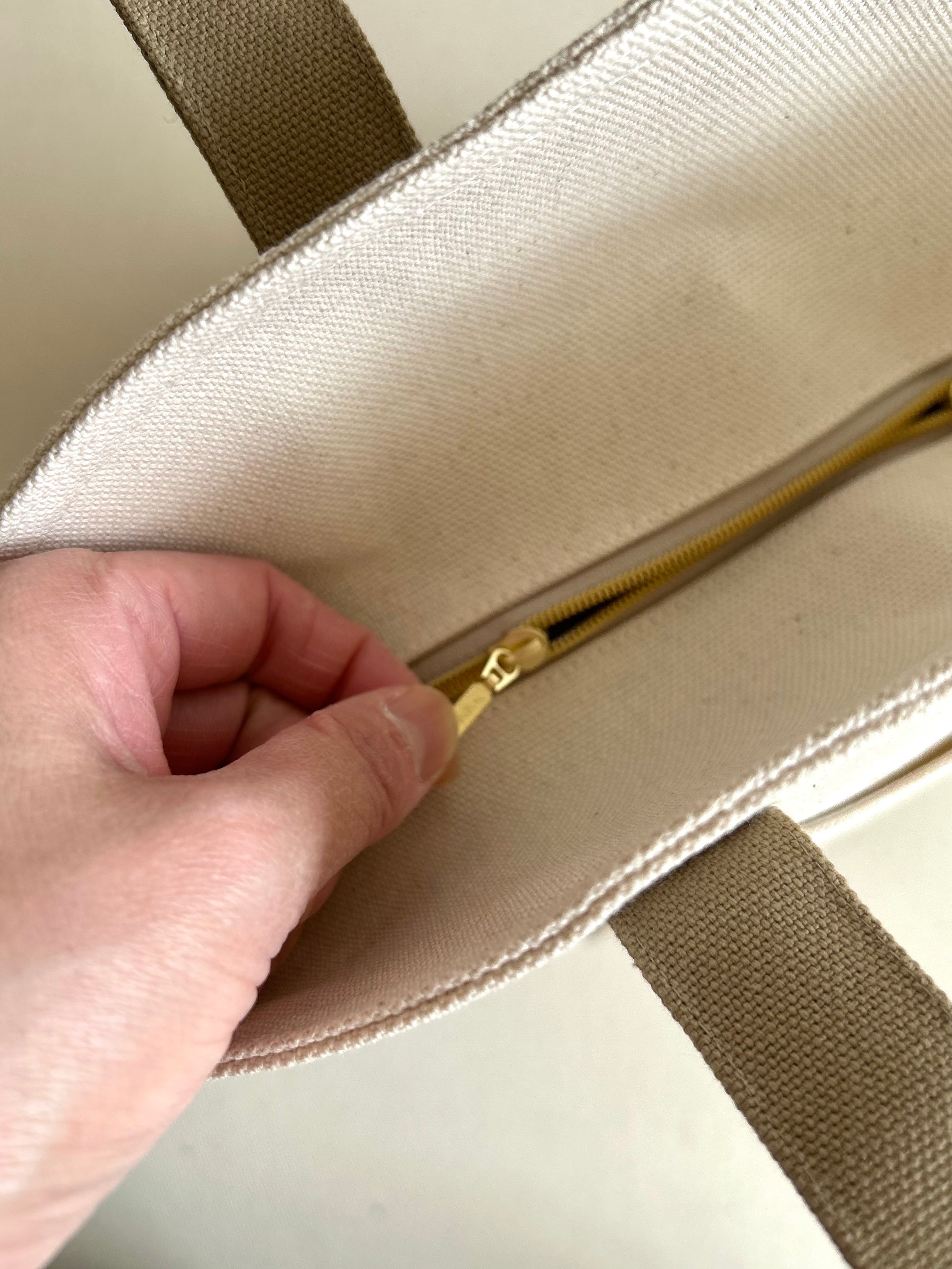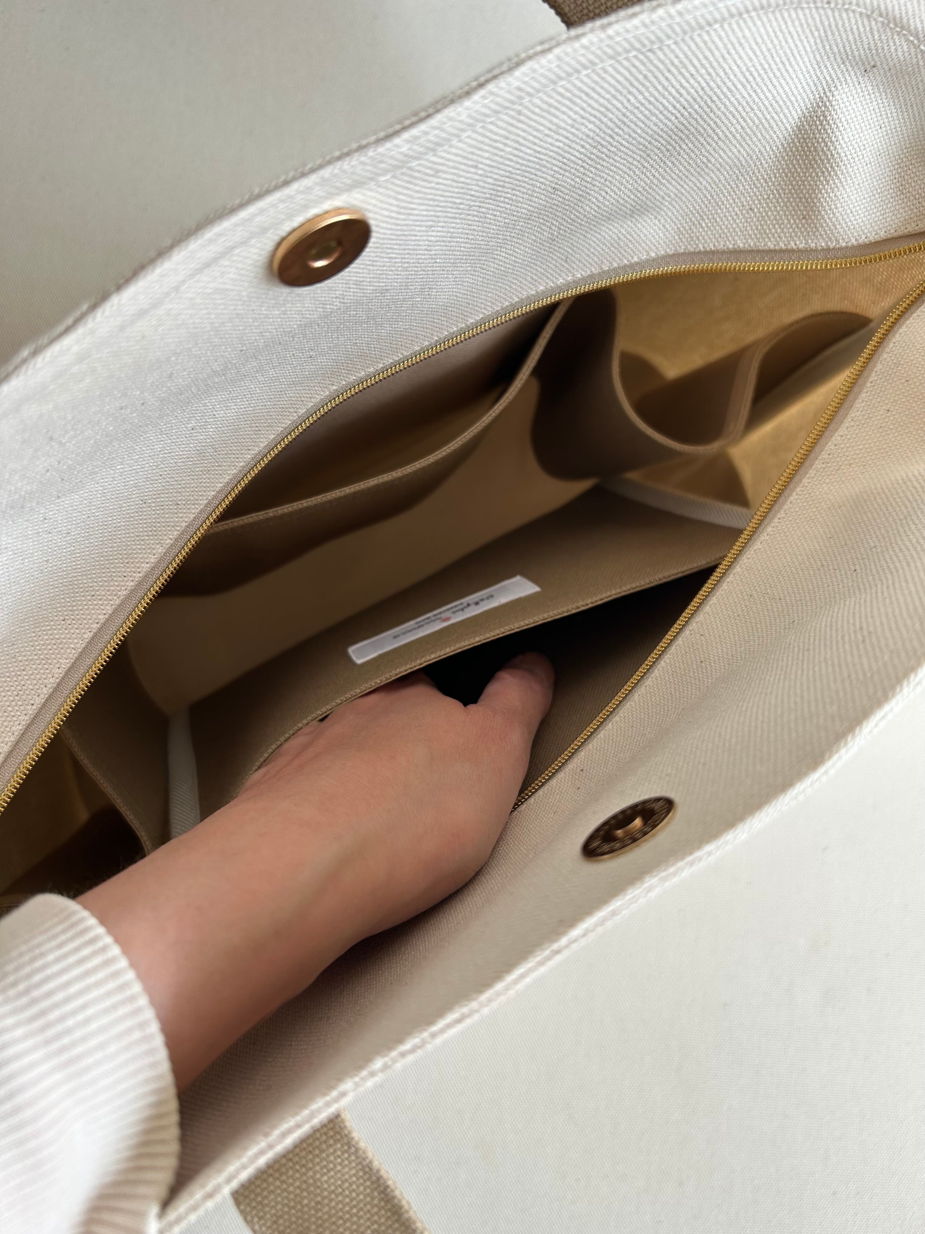 開口部にはファスナーとマグネットボタンの両方を備えており、バッグの中身が見えにくく、セキュリティ面でも安心。電車や人混みの中でも気にせずお使いいただけます。