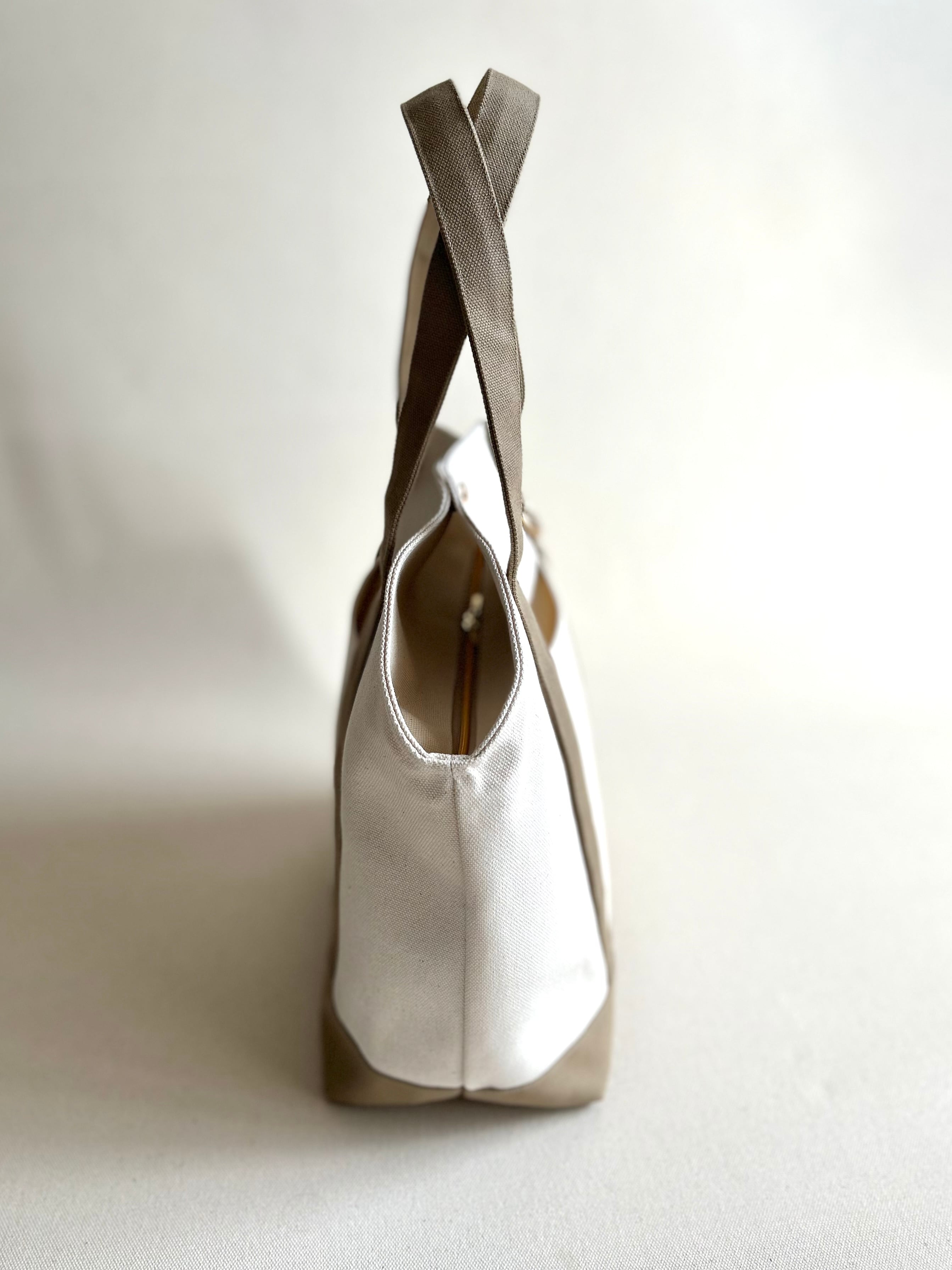 デザインは、オーソドックスなトートバッグの形に曲線を取り入れた、やわらかく上品な印象。