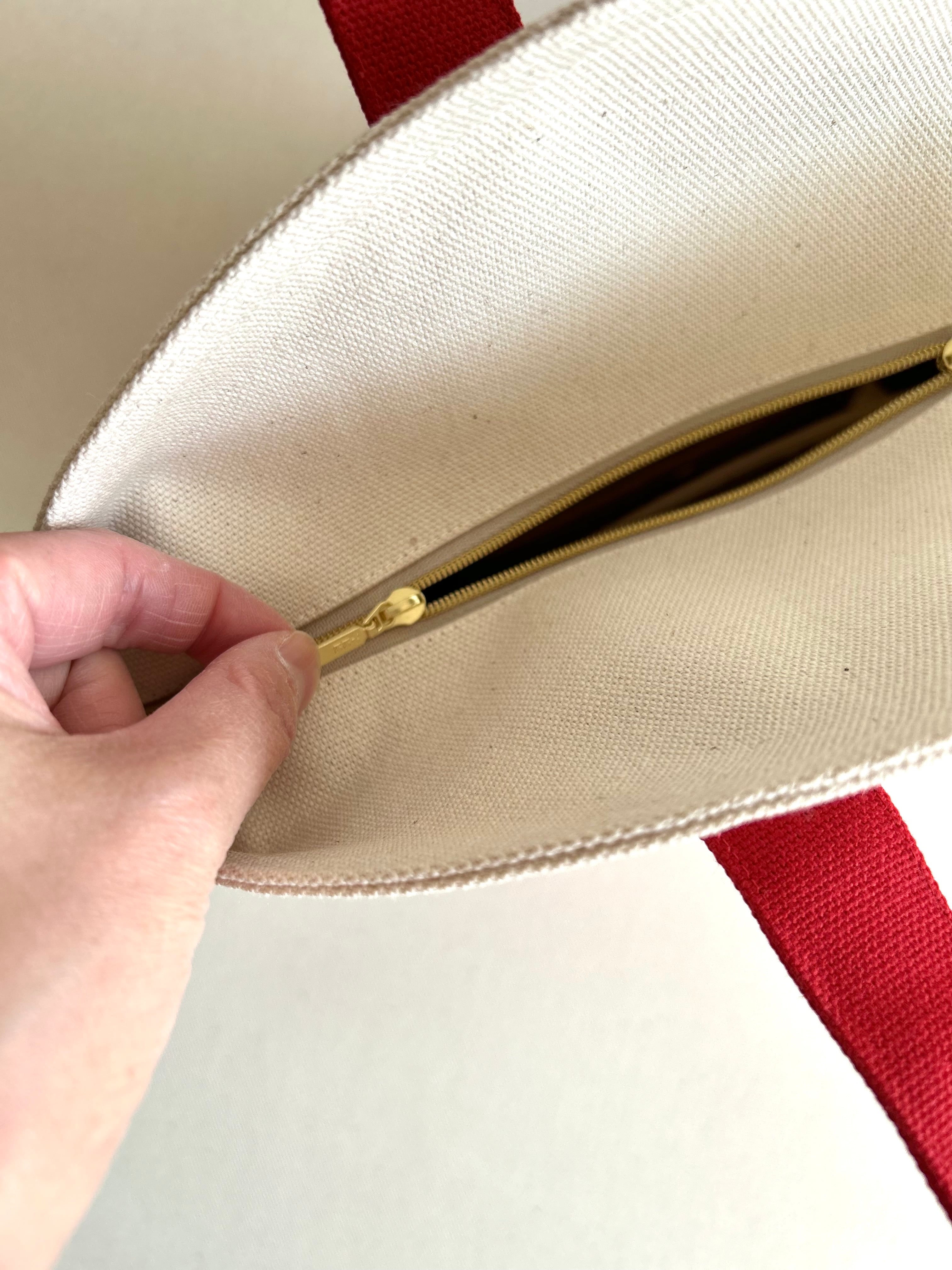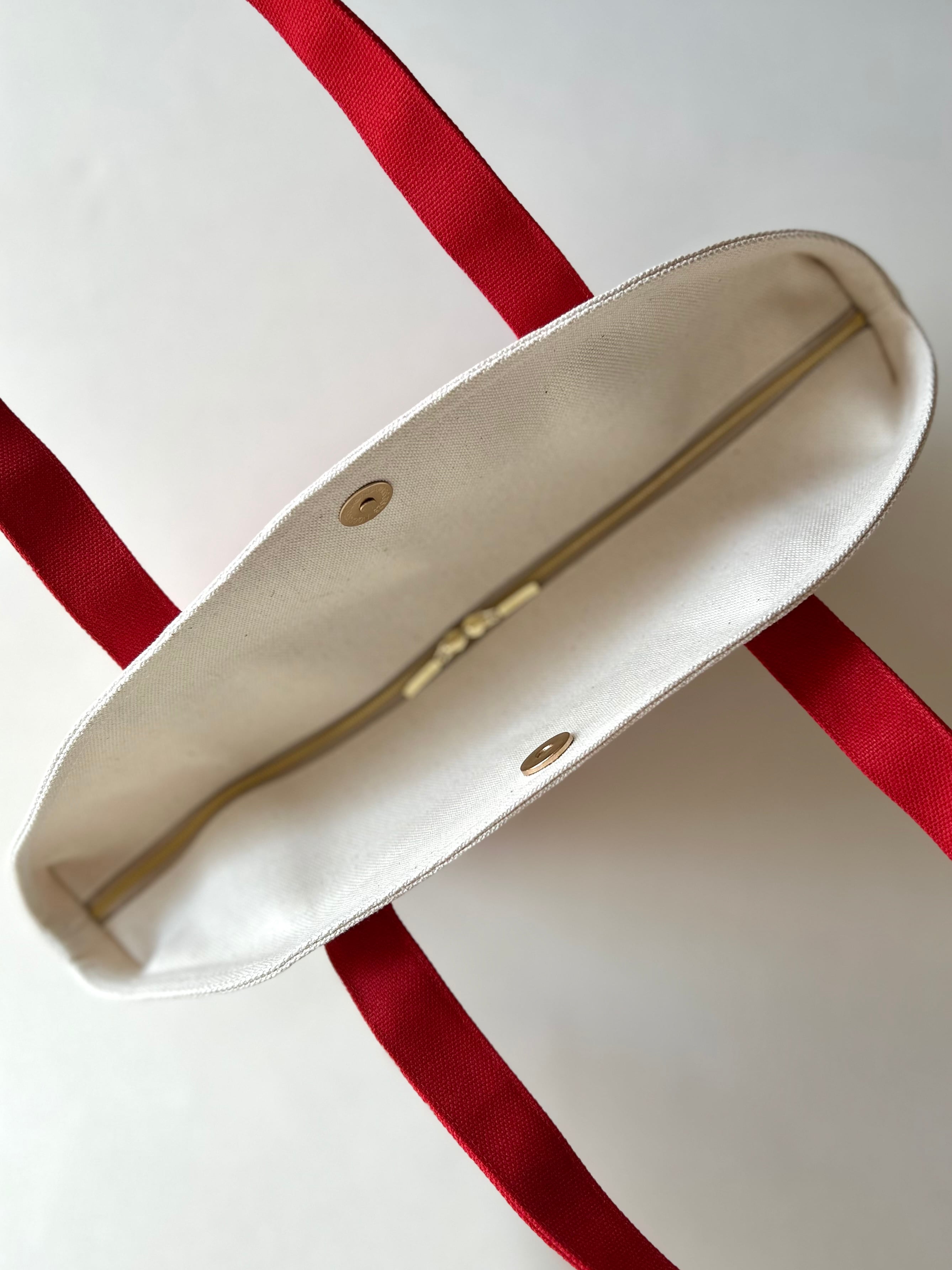 開口部にはファスナーとマグネットボタンの両方を備えており、バッグの中身が見えにくく、セキュリティ面でも安心。電車や人混みの中でも気にせずお使いいただけます。