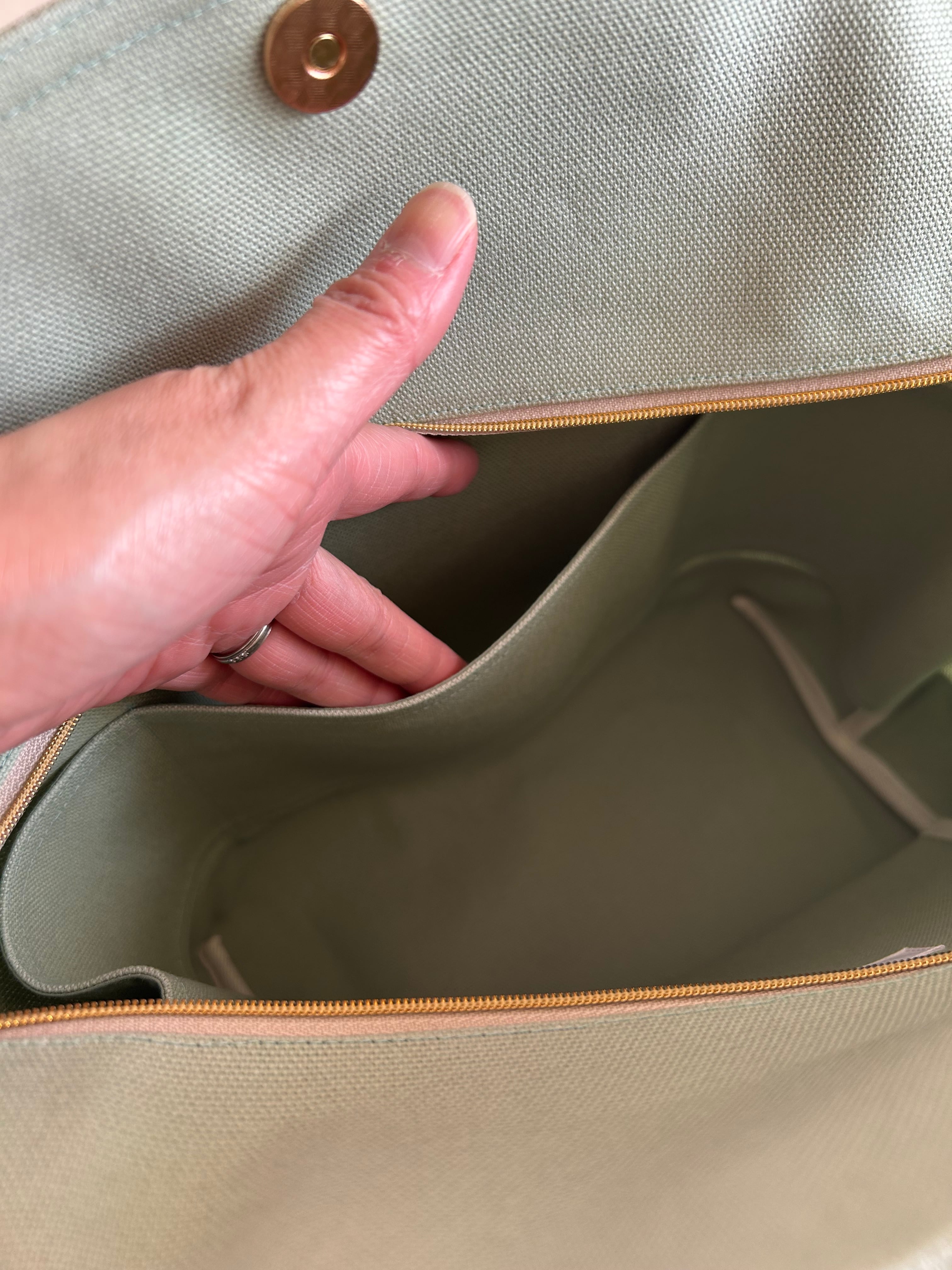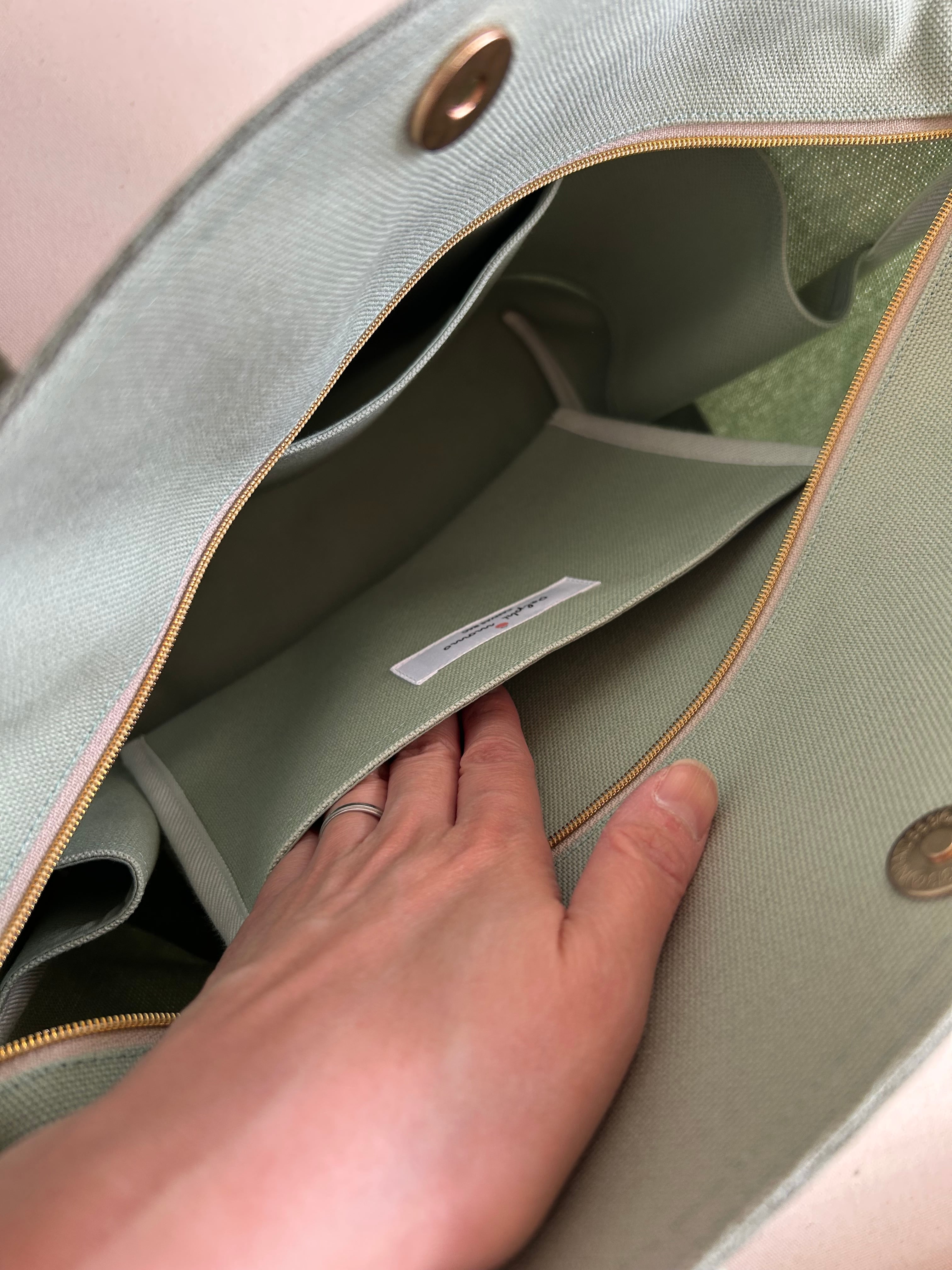開口部にはファスナーとマグネットボタンの両方を備えており、バッグの中身が見えにくく、セキュリティ面でも安心。電車や人混みの中でも気にせずお使いいただけます。