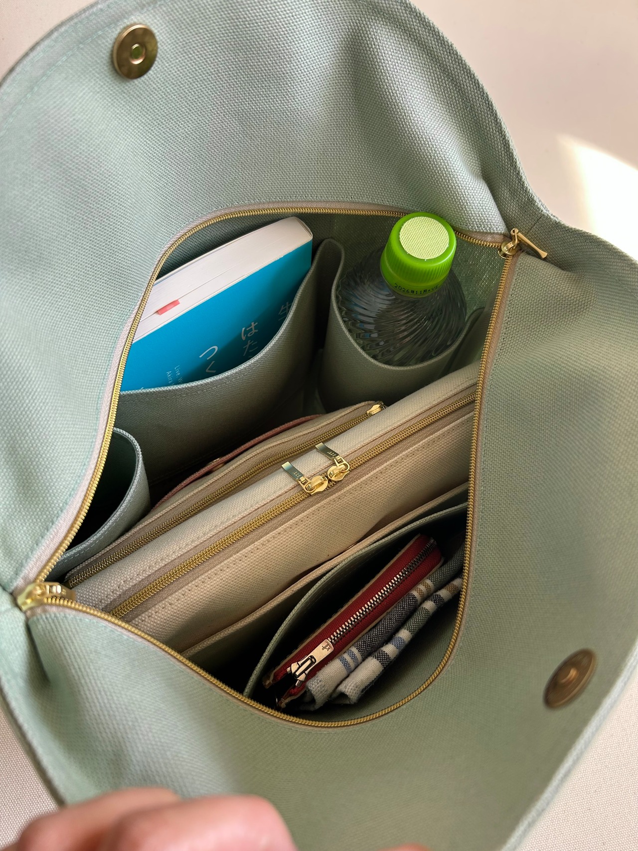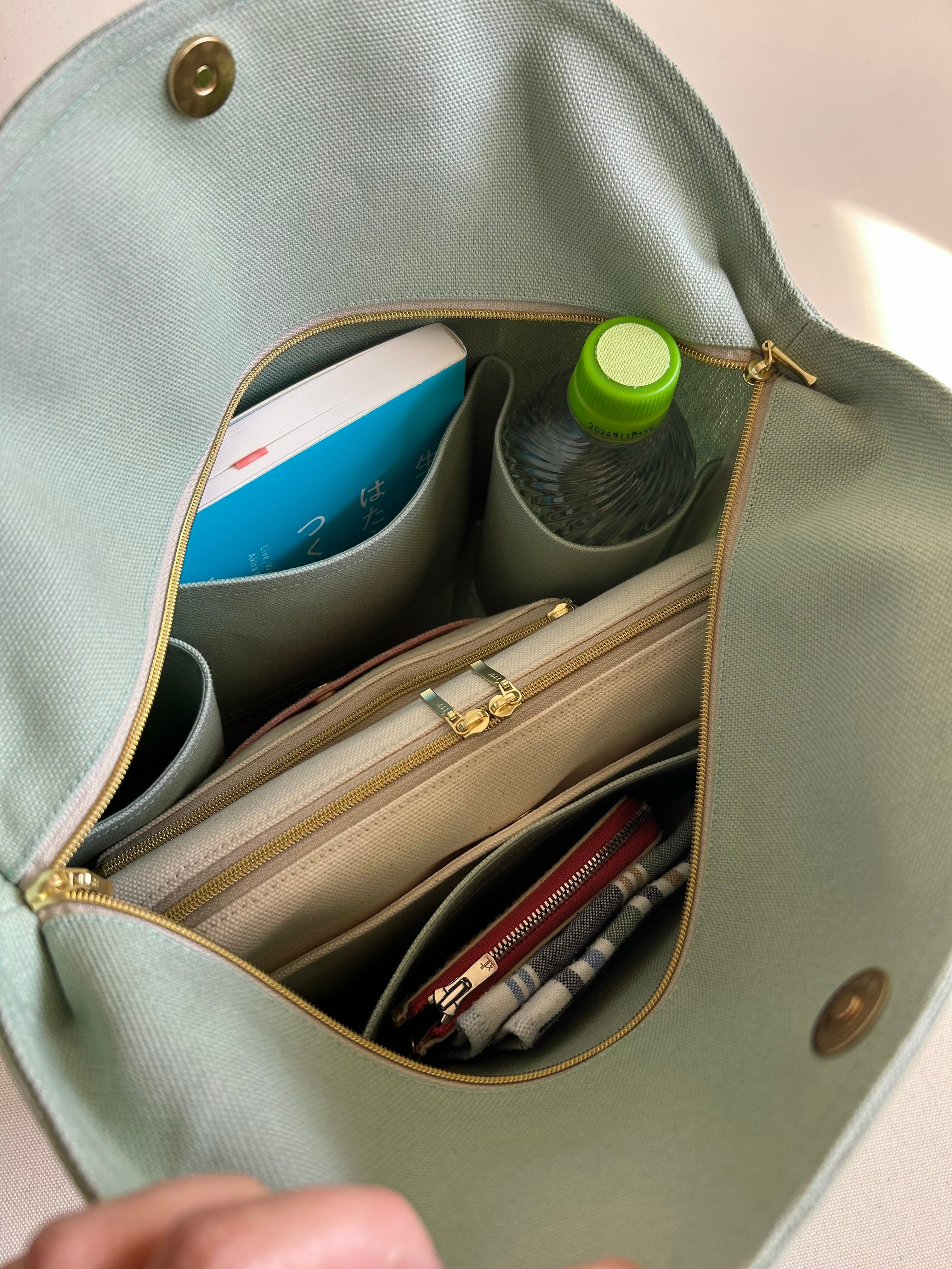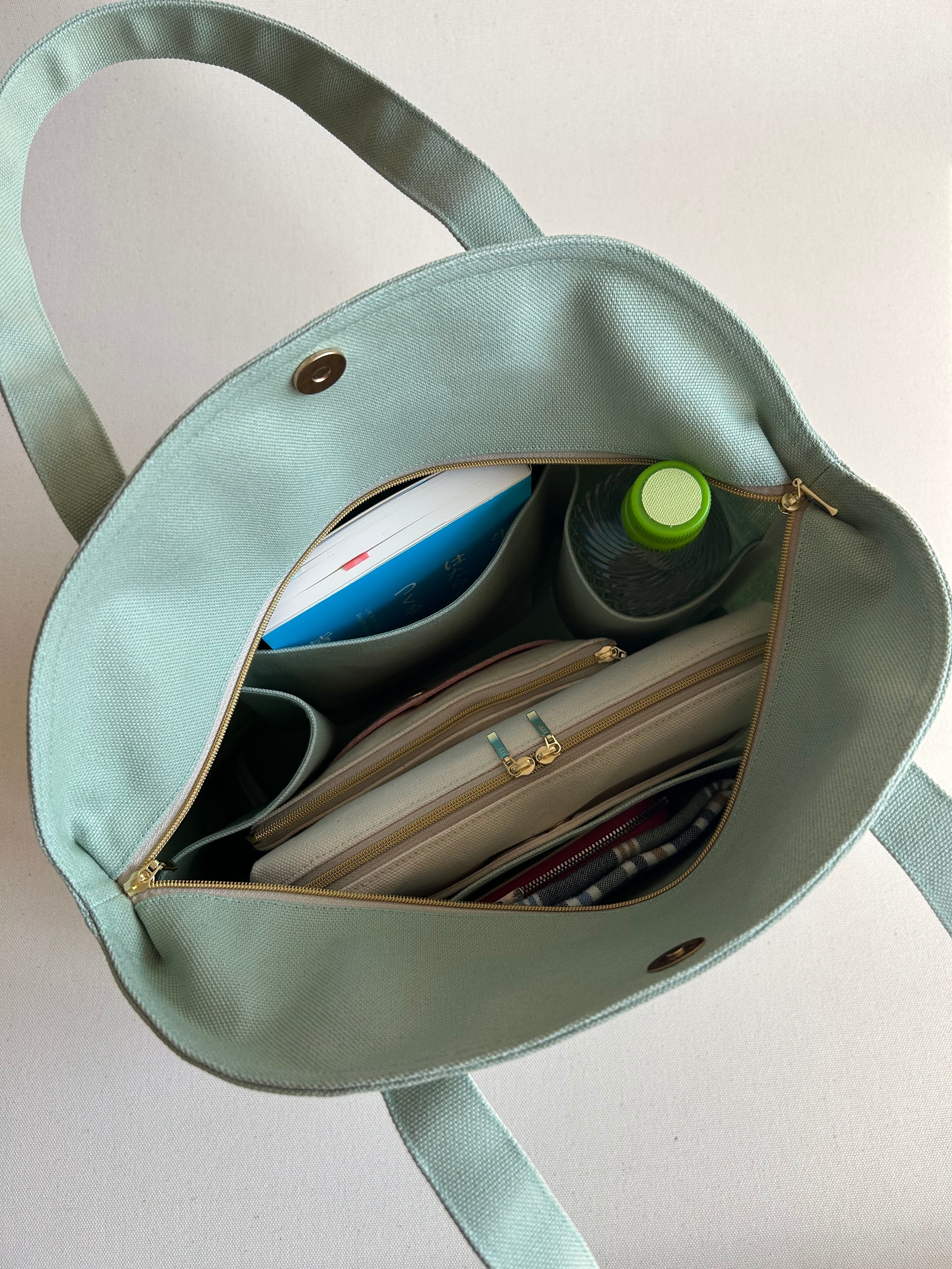 内側には、500mlペットボトルや水筒、書籍などを縦に収納できる仕切り付き。反対側には小物を整理できるポケットもあるため、バッグの中がごちゃつきにくく、すっきりと使えます。